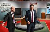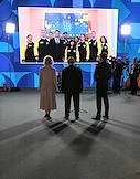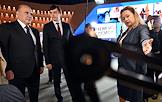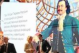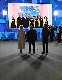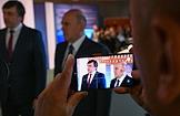 Председатель правительства России Михаил Мишустин (на экране телефона, справа) и министр просвещения России Сергей Кравцов (на экране телефона, слева) во время посещения выставки "85 лет системе СПО: сила в мастерстве!" на территории национального центра "Россия".