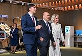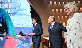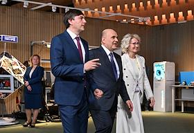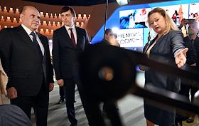 Председатель правительства России Михаил Мишустин (слева) и министр просвещения России Сергей Кравцов (в центре) во время посещения выставки "85 лет системе СПО: сила в мастерстве!" на территории национального центра "Россия".
