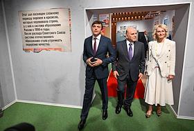 Министр просвещения России Сергей Кравцов (справа), его заместитель Владимир Желонкин (слева) и заместитель председателя Государственной думы России Виктория Абрамченко (в центре) во время посещения выставки "85 лет системе СПО: сила в мастерстве!" на территории национального центра "Россия".