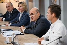 Председатель правительства России Михаил Мишустин (второй справа) во время встречи с победителями и призерами национальных чемпионатов мастерства конкурса "Мастер года", а также студентами и директорами кластеров федерального проекта "Профессионалитет", в Национальном центре "Россия".