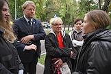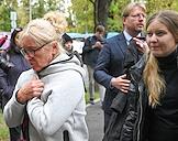 Избрание меры пресечения заместителю председателя партии "Яблоко", бывшему руководителю фракции "Яблоко" в Мосгордуме Максиму Круглову, обвиняемому в публичном распространении заведомо ложной информации об использовании Вооруженных Сил России, в Замоскворецком районном суде. Адвокат Наталия Тихонова (справа), мама Максима Круглова (слева) и председатель партии "Яблоко" Николай Рыбаков (в центре) перед началом заседания суда.