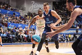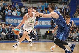 Единая лига ВТБ по баскетболу. Матч между командами "Зенит" (Санкт-Петербург) - УНИКС (Казань) на КСК "Арена". Игрок команды "Зенит" Андрей Воронцевич (слева) во время матча.