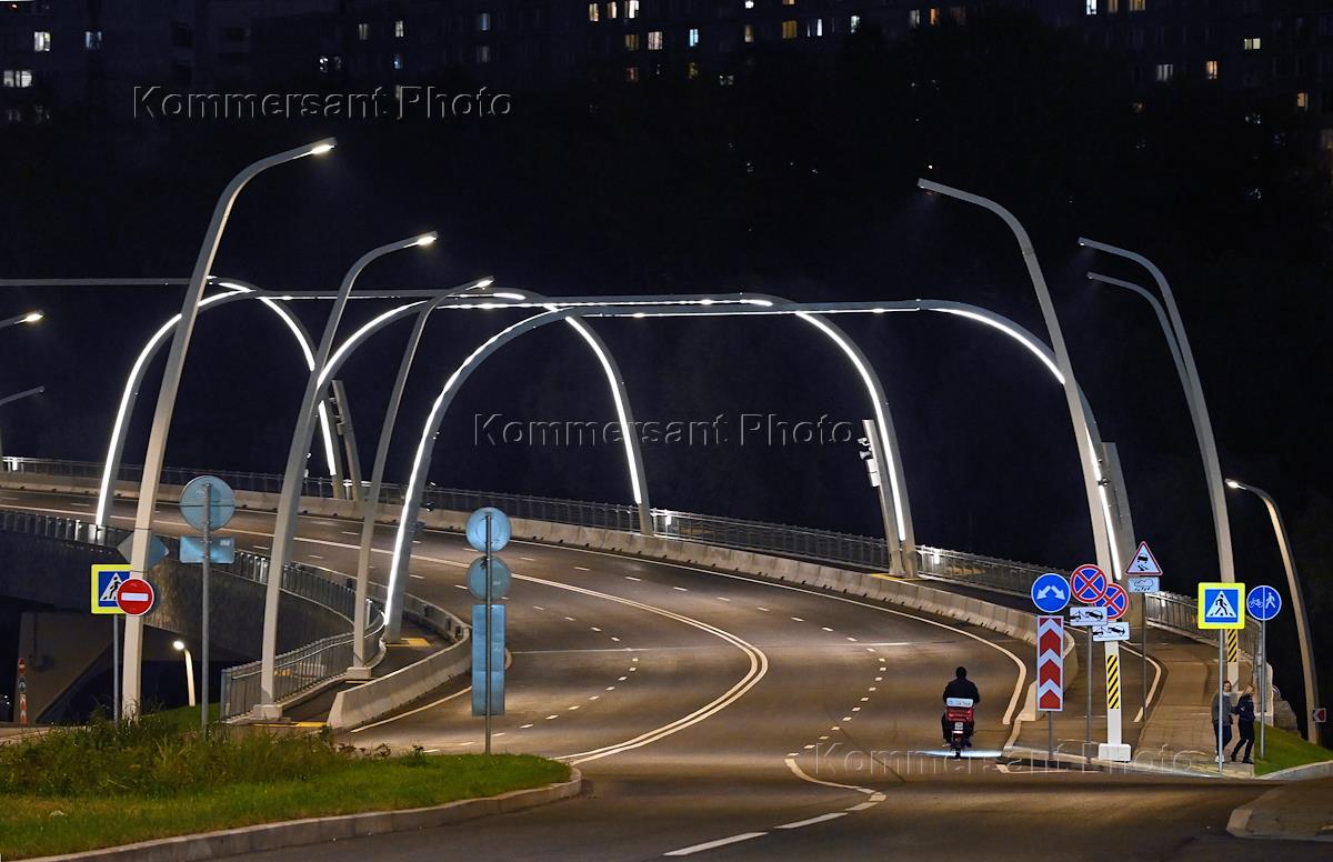 Виды Москвы. Жанровая фотография. Новый мост через реку Раменку на улице Мосфильмовская с арочной подсветкой.