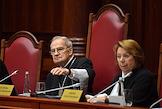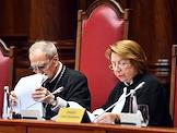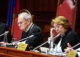 Слушание дела о проверке конституционности пунктов 1 и 2 статьи 424 ГК РФ, пункта 1 статьи 168 НК РФ, а также подпункта "а" пункта 1 статьи 1 ФЗ от 31 июля 2020 года "О внесении изменений в часть вторую Налогового кодекса Российской Федерации" в Конституционном суде (КС) России. Председатель КС России Валерий Зорькин (слева) и судья КС России Людмила Жаркова (справа) во время заседания суда.