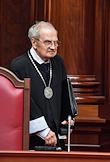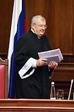 Слушание дела о проверке конституционности пунктов 1 и 2 статьи 424 ГК РФ, пункта 1 статьи 168 НК РФ, а также подпункта "а" пункта 1 статьи 1 ФЗ от 31 июля 2020 года "О внесении изменений в часть вторую Налогового кодекса Российской Федерации" в Конституционном суде (КС) России. Председатель КС России Валерий Зорькин перед началом заседания суда.