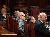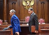 Слушание дела о проверке конституционности пунктов 1 и 2 статьи 424 ГК РФ, пункта 1 статьи 168 НК РФ, а также подпункта "а" пункта 1 статьи 1 ФЗ от 31 июля 2020 года "О внесении изменений в часть вторую Налогового кодекса Российской Федерации" в Конституционном суде (КС) России. Полномочный представитель президента России в КС России Дмитрий Мезенцев (слева) и член комитета Государственной думы (ГД) России по государственному строительству и законодательству, полномочный представитель ГД России в КС России Юрий Петров (справа) во время заседания суда.