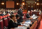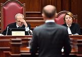 Слушание дела о проверке конституционности пунктов 1 и 2 статьи 424 ГК РФ, пункта 1 статьи 168 НК РФ, а также подпункта "а" пункта 1 статьи 1 ФЗ от 31 июля 2020 года "О внесении изменений в часть вторую Налогового кодекса Российской Федерации" в Конституционном суде России. Жанровая фотография.