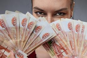 Жанровая фотография. Девушка держит денежные российские купюры достоинством 5 тысяч рублей.