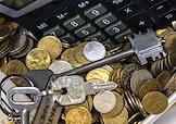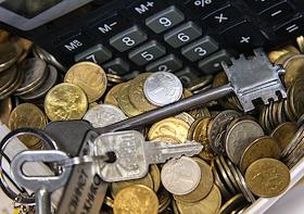 Жанровая фотография. Металлические российские мелкие деньги (копейки), ключи от квартиры и калькулятор.