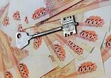 Жанровая фотография. Денежные российские купюры достоинством 5 тысяч рублей и ключ от замка.