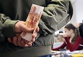 Жанровая фотография. Мужчина держит за спиной пачку денежных российских купюр достоинством 5 тысяч рублей.