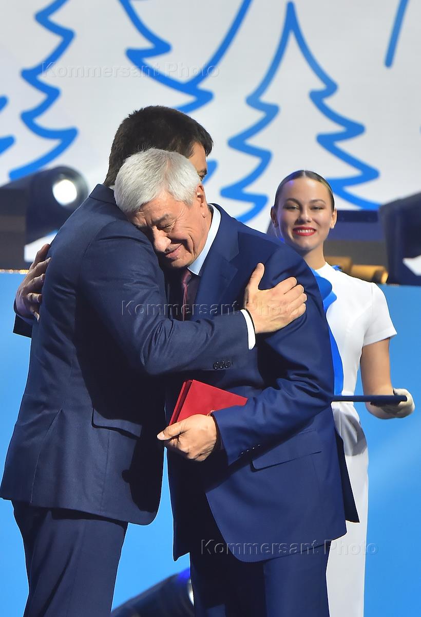 Финальный этап V Международной олимпиады по финансовой безопасности на базе Сибирского федерального университета. Председатель ПАО "Промсвязьбанк" Петр Фрадков (слева) во время церемонии награждения победителей.