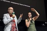 Фестиваль актуального российского кино "Маяк". Режиссер-мультипликатор Константин Бронзит (слева) и кинокритик Лариса Малюкова (справа) перед показом анимационного фильма "На выброс".