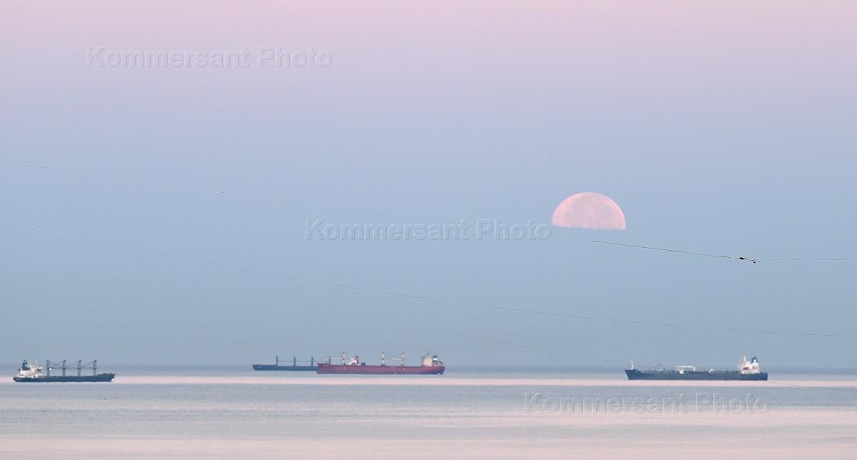 Виды Геленджика. Жанровая фотография. Морские грузовые суда в акватории Черного моря во время заката.