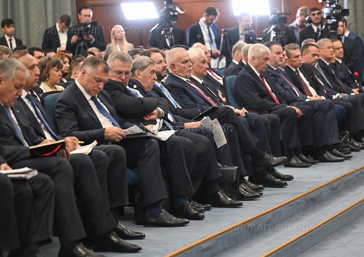 Государственный визит президента России Владимира Путина в Таджикистан. Российско-таджикские переговоры во Дворце Нации. Представители российской делегации на переговорах.