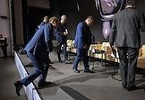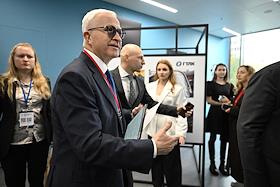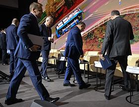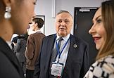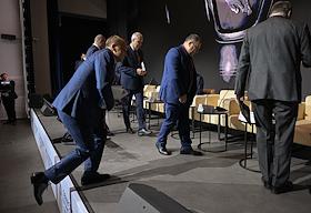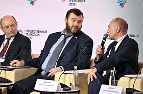 Форум "Общественный транспорт 2025" в конгресс-центре Московского Государственного Технического Университета (МГТУ) имени Н.Э. Баумана. Президент Российского союза промышленников и предпринимателей Александр Шохин (в центре) перед началом заседания форума.