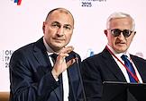 Форум "Общественный транспорт 2025" в конгресс-центре Московского Государственного Технического Университета (МГТУ) имени Н.Э. Баумана. Пленарное заседание: "Новый общественный транспорт: как модернизация транспорта меняет наши города". Председатель Совета директоров АО "Синара-Транспортные Машины" Александр Мишарин (слева) и представитель в Совете Федерации России от исполнительного органа государственной власти Запорожской области Дмитрий Ворона во время заседания.