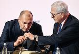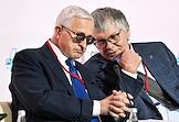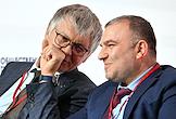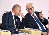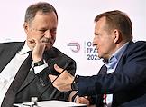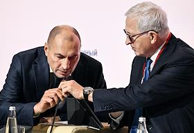 Форум "Общественный транспорт 2025" в конгресс-центре Московского Государственного Технического Университета (МГТУ) имени Н.Э. Баумана. Пленарное заседание: "Новый общественный транспорт: как модернизация транспорта меняет наши города". Президент Российского союза промышленников и предпринимателей Александр Шохин (слева) и директор дивизиона "Автобусы" группы ГАЗ Николай Одинцов во время заседания.