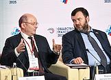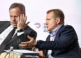 Форум "Общественный транспорт 2025" в конгресс-центре Московского Государственного Технического Университета (МГТУ) имени Н.Э. Баумана. Пленарное заседание: "Новый общественный транспорт: как модернизация транспорта меняет наши города". Президент Российского союза промышленников и предпринимателей (РСПП) Александр Шохин (справа) и член правления РСПП, председатель Комитета РСПП по инвестиционной политике, институтам развития и экспортной поддержке, председатель Правления Некоммерческого партнерства "Национальное агентство прямых инвестиций" Игорь Вдовин (слева) во время заседания.