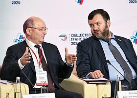 Форум "Общественный транспорт 2025" в конгресс-центре Московского Государственного Технического Университета (МГТУ) имени Н.Э. Баумана. Пленарное заседание: "Новый общественный транспорт: как модернизация транспорта меняет наши города". Заместитель генерального директора АО "Государственная транспортная лизинговая компания" Владимир Добровольский (слева) и председатель Совета директоров АО "Синара-Транспортные Машины" Александр Мишарин во время заседания.