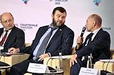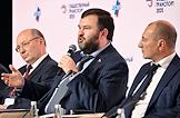 Форум "Общественный транспорт 2025" в конгресс-центре Московского Государственного Технического Университета (МГТУ) имени Н.Э. Баумана. Пленарное заседание: "Новый общественный транспорт: как модернизация транспорта меняет наши города". Слева направо: председатель Совета директоров АО "Синара-Транспортные Машины" Александр Мишарин, представитель в Совете Федерации России от исполнительного органа государственной власти Запорожской области Дмитрий Ворона и член правления РСПП, председатель Комитета РСПП по инвестиционной политике, институтам развития и экспортной поддержке, председатель Правления Некоммерческого партнерства "Национальное агентство прямых инвестиций" Игорь Вдовин во время заседания.