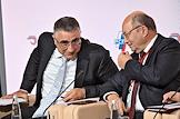 Форум "Общественный транспорт 2025" в конгресс-центре Московского Государственного Технического Университета (МГТУ) имени Н.Э. Баумана. Пленарное заседание: "Новый общественный транспорт: как модернизация транспорта меняет наши города". Ректор МГТУ им. Н.Э. Баумана Михаил Гордин (слева) и генеральный директор "Мосгортранс" Николай Асаул (справа) во время заседания.