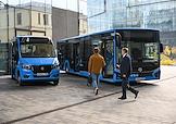 Форум "Общественный транспорт 2025" в конгресс-центре Московского Государственного Технического Университета (МГТУ) имени Н.Э. Баумана. Выставка в рамках форума. Электробус малого класса "ГАЗель e-City" (слева) и автобуса большого класса "Citymax 12" (справа) на выставке.