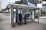 Форум "Общественный транспорт 2025" в конгресс-центре Московского Государственного Технического Университета (МГТУ) имени Н.Э. Баумана. Выставка в рамках форума. Остановочный павильон серии DMA-19 компании "ДиМедиа" на выставке.