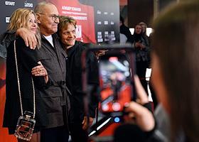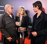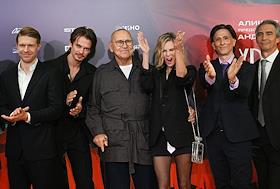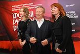 Премьерный показ киноромана режиссера Андрея Кончаловского "Хроники русской революции" в кинотеатре "Октябрь". Режиссер Андрей Кончаловский (в центре), актеры Юлия Высоцкая (слева) и Евгений Ткачук (справа) на премьере.