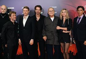 Премьерный показ киноромана режиссера Андрея Кончаловского "Хроники русской революции" в кинотеатре "Октябрь". Слева направо: актеры Александр Мизёв, Евгений Ткачук, Никита Ефремов, Никита Каратаев, режиссер Андрей Кончаловский, актеры Юлия Высоцкая и Тимофей Окроев на премьере.