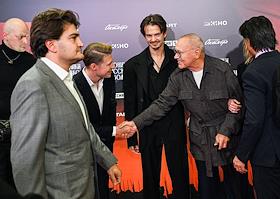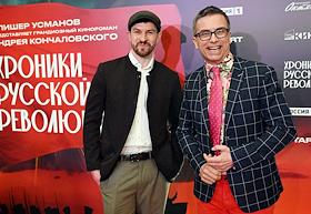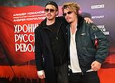 Премьерный показ киноромана режиссера Андрея Кончаловского "Хроники русской революции" в кинотеатре "Октябрь". Актер Атон Бирюков (слева) на премьере.