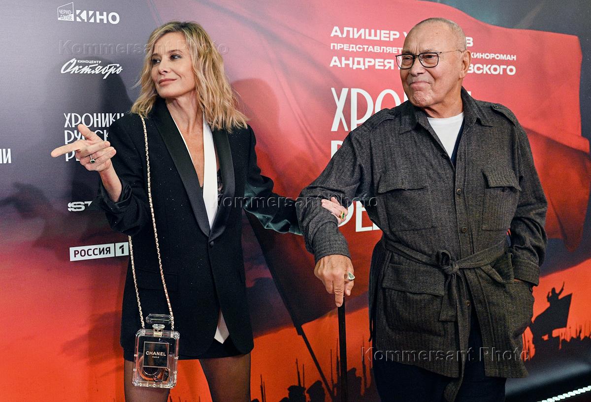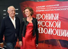 Премьерный показ киноромана режиссера Андрея Кончаловского "Хроники русской революции" в кинотеатре "Октябрь". Режиссер Андрей Кончаловский (справа) и актриса Юлия Высоцкая (слева) на премьере.