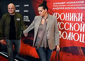 Премьерный показ киноромана режиссера Андрея Кончаловского "Хроники русской революции" в кинотеатре "Октябрь". Актер Никита Тарасов (справа) с супругой Мариной на премьере.