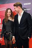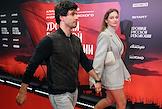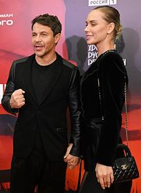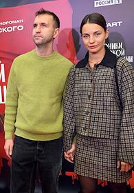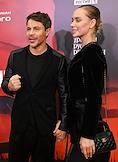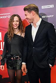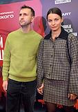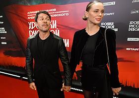 Премьерный показ киноромана режиссера Андрея Кончаловского "Хроники русской революции" в кинотеатре "Октябрь". Актер Павел Деревянко (слева) с супругой дизайнером Зоей Фуць (справа) на премьере.