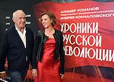 Премьерный показ киноромана режиссера Андрея Кончаловского "Хроники русской революции" в кинотеатре "Октябрь". Режиссер, продюсер Сергей Гинзбург (слева) и актриса Ольга Виниченко (справа) на премьере.