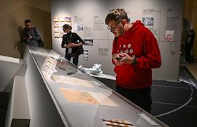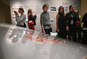 Пресс-показ выставки "Счастливая жизнь в квадрате. Выксунский эксперимент и индустриальное домостроение в СССР" в Музее истории ВМЗ и в квартире первого экспериментального дома в Выксе. Посетители на выставке в Музее истории ВМЗ (АО "Выксунский металлургический завод").