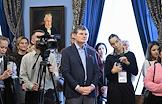 Пресс-показ выставки "Счастливая жизнь в квадрате. Выксунский эксперимент и индустриальное домостроение в СССР" и церемония открытия третьей части выставочного цикла "Путевые заметки" - "Привал", представляющего произведения из коллекции Ирины и Анатолия Седых. Председатель правления АО "Объединённая металлургическая компания" Анатолий Седых (в центре) на церемонии.