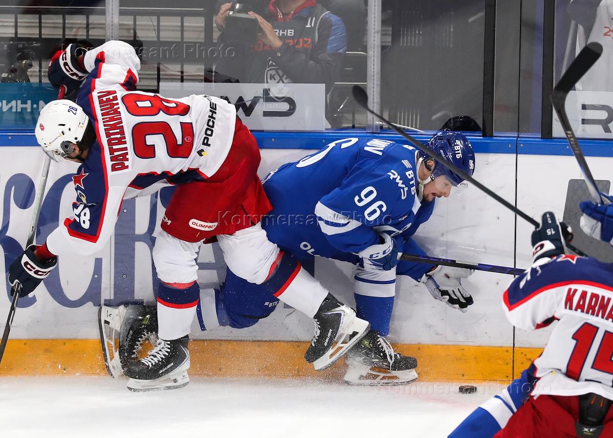Континентальная Хоккейная Лига (КХЛ). Матч между командами "Динамо" (Москва) - ЦСКА (Москва) на стадионе "ВТБ Арена". Игрок команды ЦСКА Прохор Полтапов (справа) и игрок команды "Динамо" Магомед Шараканов (слева) во время матча.