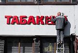 Жанровая фотография. Рабочий вешает вывеску "Табак".