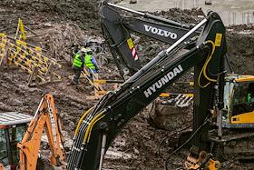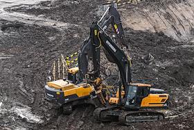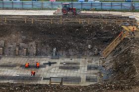 Жанровая фотография. Строительство многоэтажного жилого дома. Строительная техника во время рытья котлована.