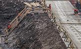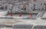 Жанровая фотография. Строительство многоэтажного жилого дома. Рабочие на строительной площадке в котловане.