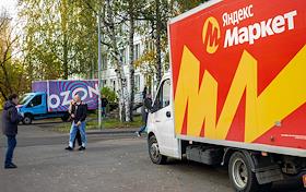 Виды Санкт-Петербурга. Жанровая фотография. Грузовые машины служб доставки "Озон" и "Яндекс. Маркет" на улице города.