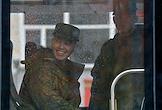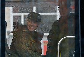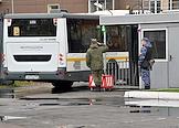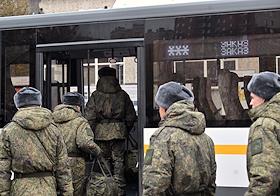 Осенний призыв в Вооруженные силы России. Отправка призывников к месту прохождения военной службы. Призывники в автобусе на территории сборного пункта военного комиссариата.
