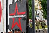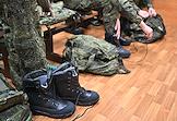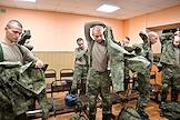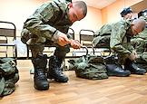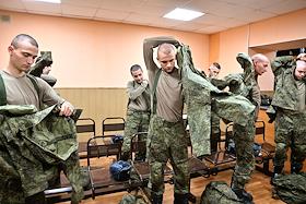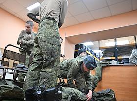 Осенний призыв в Вооруженные силы России. Отправка призывников к месту прохождения военной службы. Призывники во время получения формы в сборном пункте военного комиссариата.