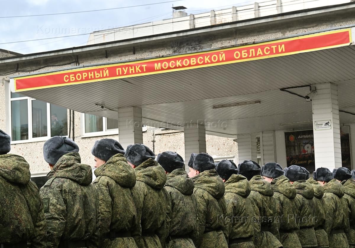Осенний призыв в Вооруженные силы России. Отправка призывников к месту прохождения военной службы в сборном пункте военного комиссариата.