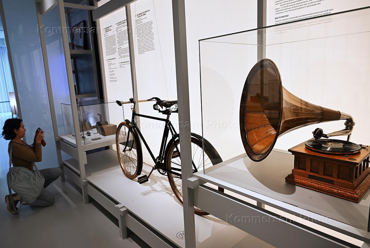 Пресс-показ выставки "Свой человек. Владимир Гиляровский" в Музее русского импрессионизма. Экспонаты выставки - фонограф Эдисона с рупором, валик к фонографу и портативный патефон Pathe Diamond со встроенным рупором и мембранной.