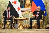 Российско-сирийские переговоры в Кремле. Президент России Владимир Путин (в центре) и президент Сирии Ахмед аш-Шараа (справа) во время переговоров.