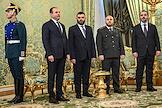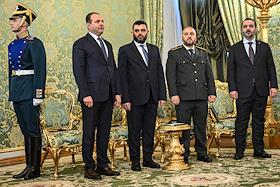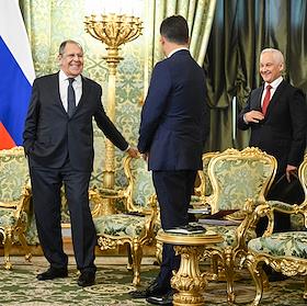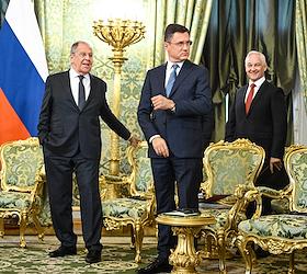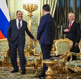 Российско-сирийские переговоры в Кремле. Слева направо: министр иностранных дел России Сергей Лавров, заместитель председателя правительства России Александр Новак и министр обороны России Андрей Белоусов перед началом переговоров.