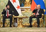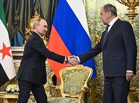 Российско-сирийские переговоры в Кремле. Президент России Владимир Путин (слева) и министр иностранных дел России Сергей Лавров (справа) перед началом переговоров.