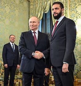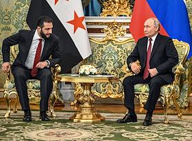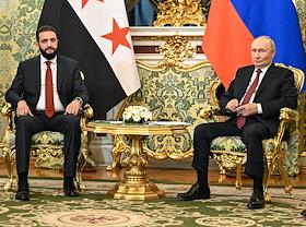 Российско-сирийские переговоры в Кремле. Президент России Владимир Путин (слева) и президент Сирии Ахмед аш-Шараа во время переговоров.